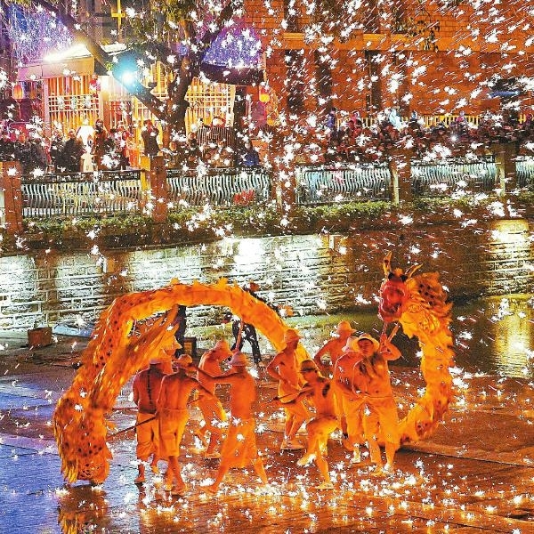 2月13日正月初二,成都市锦江东门码头上钢花飞溅、金龙腾飞,传统民俗“打火龙”表演让市民、游客看得过瘾。