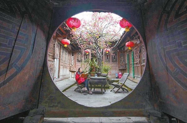 ←2月18日正月初七,阆中古城张家小院的百年海棠迎春绽放,满树的花朵像巨伞一般“撑”满了天井,一名女士在盛开的海棠树下看书休闲。