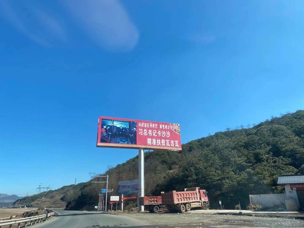 行车将近两个小时,路边一座高大的广告牌在青山衬托下中格外醒目,红色的背景板上面写着两句话“习总书记卡沙沙,精准扶贫瓦吉瓦”。
