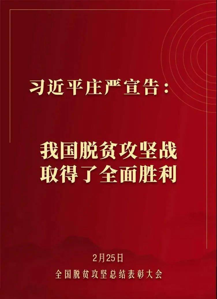 今天,我们隆重召开大会,庄严宣告,经过全党全国各族人民共同努力,在迎来中国共产党成立一百周年的重要时刻,我国脱贫攻坚战取得了全面胜利,现行标准下9899万农村贫困人口全部脱贫,832个贫困县全部摘帽,12.8万个贫困村全部出列,区域性整体贫困得到解决,完成了消除绝对贫困的艰巨任务,创造了又一个彪炳史册的人间奇迹!这是中国人民的伟大光荣,是中国共产党的伟大光荣,是中华民族的伟大光荣!