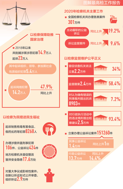 2020年,刑事检察更加有力,民事检察更为精准,行政检察持续做实,公益诉讼检察有序拓展,检察机关在严格依法履职中促进社会公平正义。