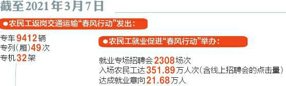 截至3月7日,全省共举办农民工就业专场招聘会2308场次,入场农民工达351.89万人次(含线上招聘会的点击量),达成就业意向21.68万人。