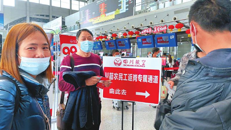 “今年以来,全省各级人社部门和农民工服务机构坚定贯彻中央和省委有关农民工工作的重要决策部署,积极履行牵头抓总职能,春节前后农民工服务保障工作推进有力有序。”四川省人力资源和社会保障厅(以下简称“省人社厅”)农民工工作处相关负责人介绍,尤其是春节后,全省各地大力实施农民工返岗交通运输“春风行动”和农民工就业促进“春风行动”。在两场“春风行动”保障下,广大川籍农民工安全有序返岗,平安顺利就业。截至3月7日,全省已返岗务工农民工476.1万人,超过春节前后返乡农民工总数470.2万人。超过春节期间未返乡且已复工的农民工,全省农民工转移就业2579.2万人,比去年同期增加867.3万人。□刘云飞(图片由省人社厅提供)返岗“春风”,助农民工“出家门、上车门、进厂门”