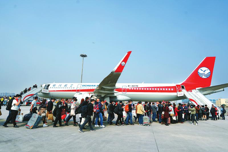 2月23日,四川春节后集中大规模包机送农民工返岗的首架专机从成都双流国际机场飞往广东。