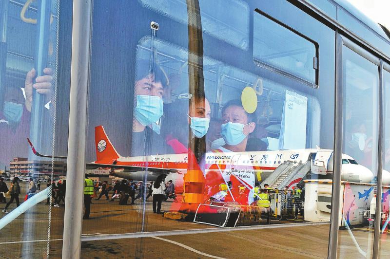 2月23日,我省春节后集中大规模包机送农民工返岗的首架专机在成都双流国际机场准备起飞。图为农民工在摆渡车上看即将起飞的专机。