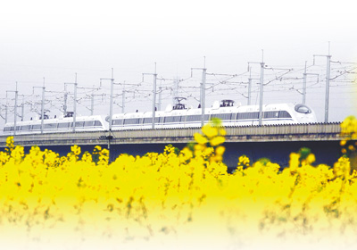 江西省峡江县水边镇义桥村,列车从油菜花丛中疾驰而过。徐 铮摄(人民视觉)