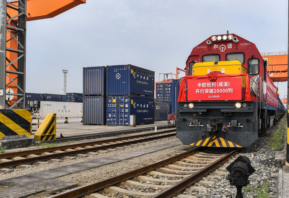 中欧班列(成渝)列车在成都国际铁路港等待发车(2022年6月30日摄)。新华社记者 王曦 摄