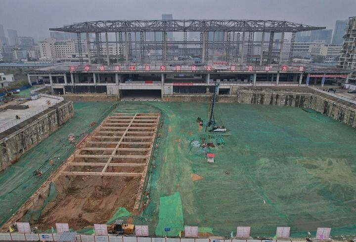 2022年12月15日,成都站扩能改造现场,部分站房钢结构搭建已经完成(无人机照片)。新华社记者 杨进 摄