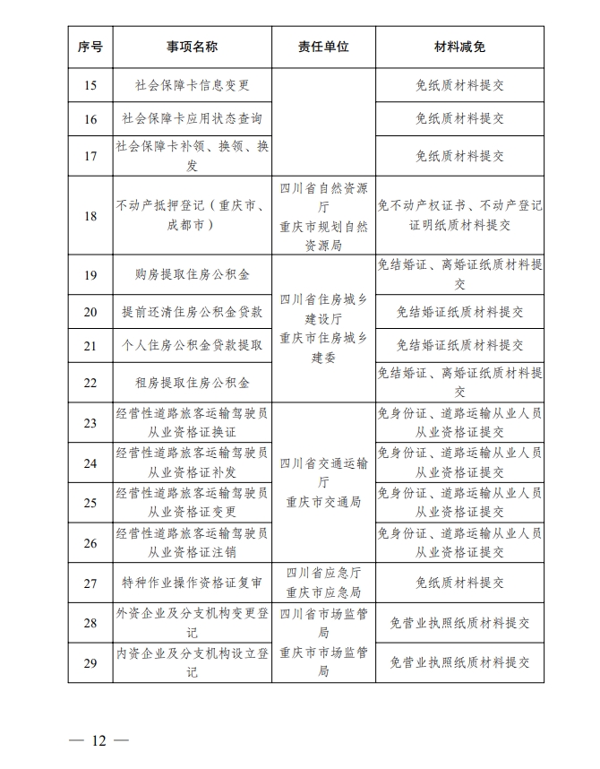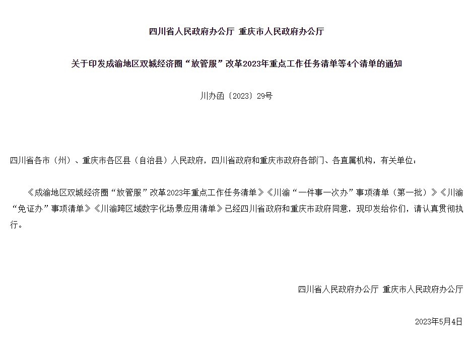 日前,四川省人民政府办公厅、重庆市人民政府办公厅联合印发《成渝地区双城经济圈“放管服”改革2023年重点工作任务清单》《川渝“一件事一次办”事项清单(第一批)》《川渝“免证办”事项清单》《川渝跨区域数字化场景应用清单》等4个清单,旨在贯彻落实川渝两省市《2023年政府工作报告》相关决策部署和推动成渝地区双城经济圈建设重庆四川党政联席会议第六次会议精神,更好服务成渝地区双城经济圈建设重大战略。