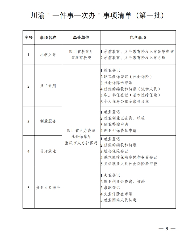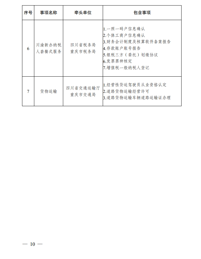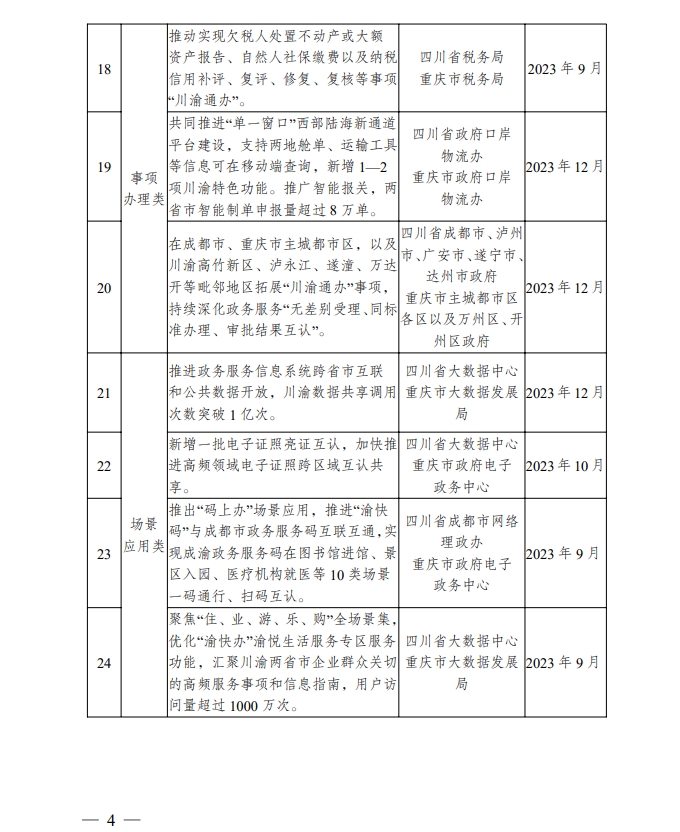 首次推出川渝“一件事一次办”和“免证办”事项清单。在前期三批共311项高频政务服务事项实现“川渝通办”的基础上,将多个部门相关联的“单项事”整合为企业和群众视角的“一件事”,梳理出“小学入学”“员工录用”“新办纳税”“货物运输”等7个川渝“一件事一次办”套餐式服务事项,计划于2023年11月底前推动实现“川渝通办”。在前期30项电子证照实现川渝互认共享的前提下,梳理推出34项川渝“免证办”事项,推动“川渝通办”从“能办”向“好办”“易办”转变。