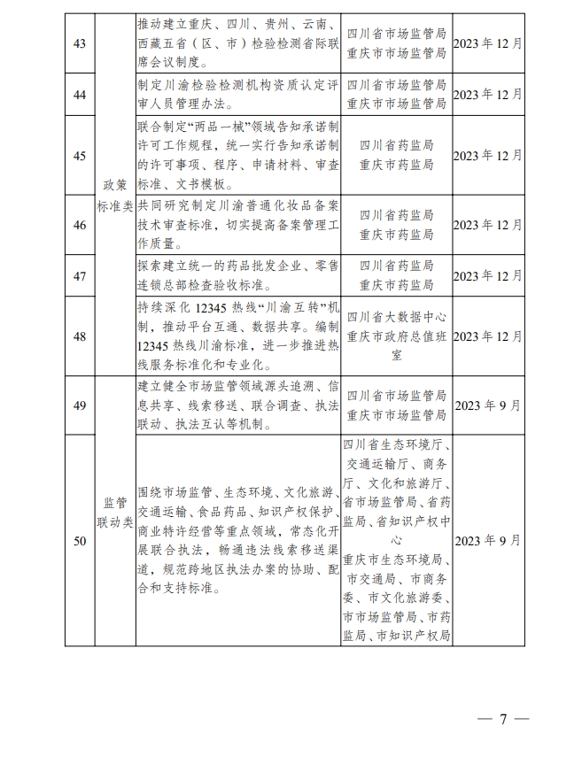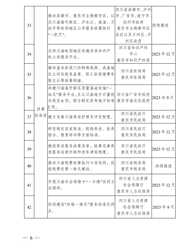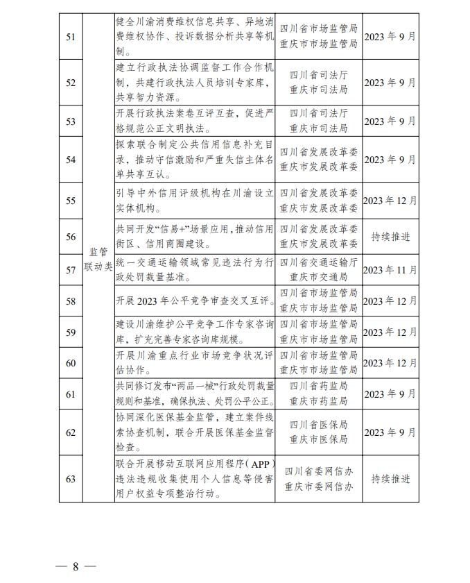 优化营商环境助力成渝地区双城经济圈建设。《成渝地区双城经济圈“放管服”改革2023年重点工作任务清单》对协同推进成渝地区双城经济圈“放管服”改革全年工作进行总体安排,聚焦持续深化改革、优化营商环境、激发市场活力、提振市场信心,梳理了4大类63项重点任务,均明确了牵头单位和完成时限。其中:事项办理类有20项工作任务,主要推动户籍、社保、住房公积金、林草等领域更多高频政务服务事项“川渝通办”,共同研究企业在“川渝开发合作区”虚拟地址注册登记;场景应用类有9项工作任务,重点推进政务服务信息系统跨省市互联和公共数据开放,有序推进更多的电子证照互认共享;政策标准类有19项工作任务,重点推动税费、知识产权、公共服务、检验检测等政策标准相对统一;监管联动类有15项工作任务,重点是建立健全信息共享、线索移送、联合调查、执法联动、执法互认等机制。