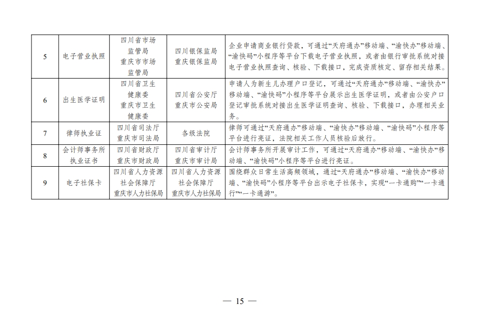 探索打造新一批川渝跨区域数字化场景应用试点。把跨区域场景应用作为推进数字化改革的重要抓手,按照“大场景小切口”的思路,进一步丰富“电子营业执照”“电子社保卡”“医保电子凭证”在川渝两地的应用场景,提升数字化服务效能,为企业群众办事添便利增动力。通过结婚证、医保卡、营业执照、社保卡等9类电子证照互认共享,在社保、医疗、企业经营等重点领域打造一批数字化场景应用试点,让两地企业、群众办事高效、省时省力,进一步享受公共服务数字化便利,持续打造企业和群众所期所盼的营商环境。