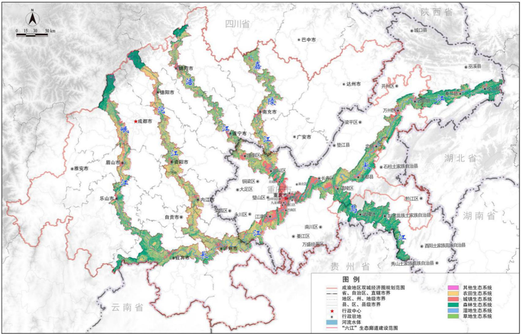 “六江”即长江、嘉陵江、乌江、岷江、涪江、沱江,由其组成的生态廊道是连接成渝地区双城经济圈的天然纽带,具有水土保持、净化空气、调节气候、保持生物多样性、提升碳汇能力等多种生态系统服务功能,串联成渝双核及46个重要节点城市。
