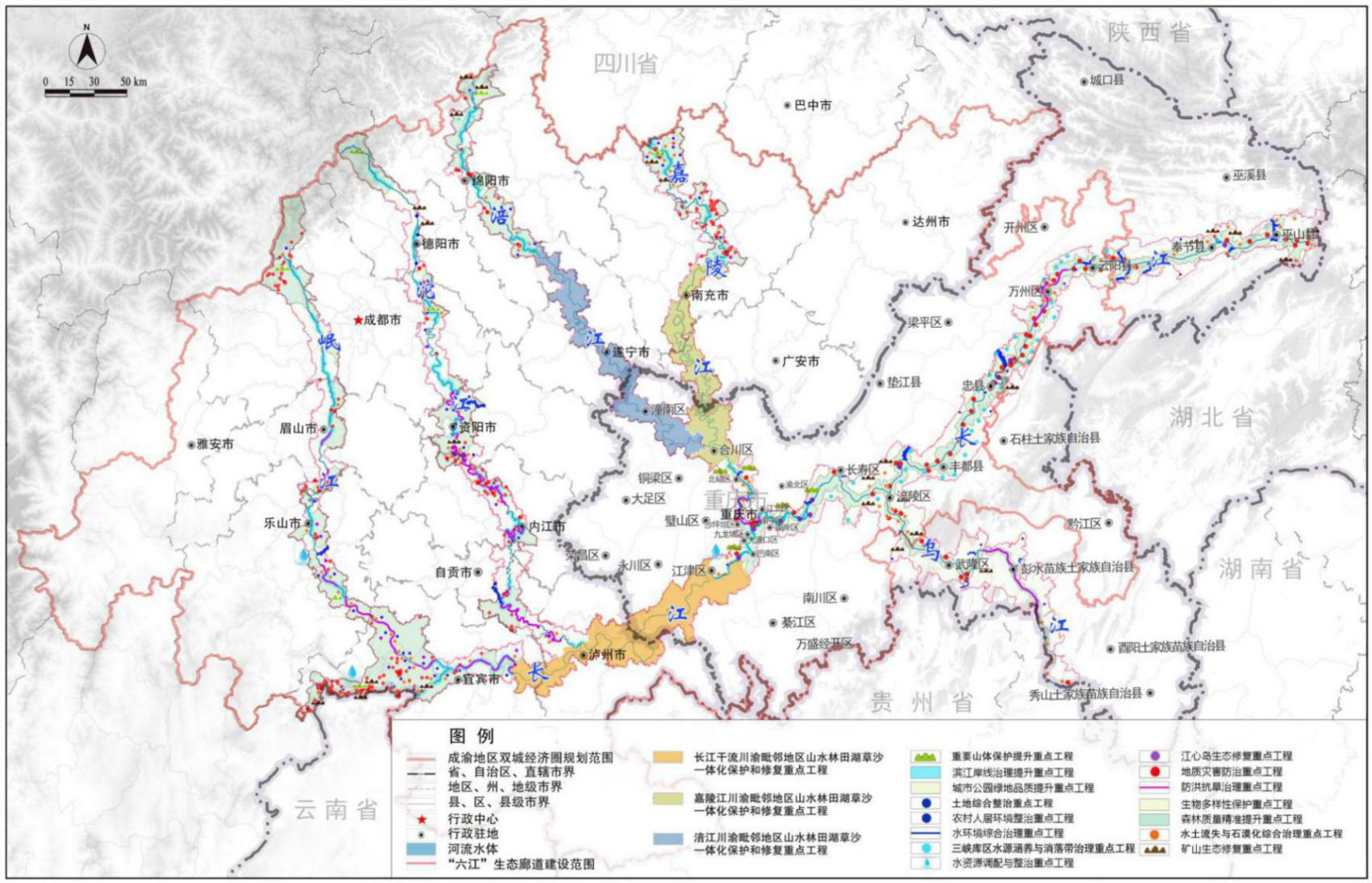以“六江”干流、水陆交界带为核心,以流域生态安全屏障区、生态环境脆弱区、生态问题集中分布区为重点,《“六江”规划》统筹部署和实施“1+7”生态保护修复行动计划和21项重点工程。例如,为强化川渝毗邻地区跨区域生态保护修复,谋划了“山水林田湖草沙一体化保护和修复行动计划”,包括长江干流、嘉陵江干流、涪江干流等3项川渝毗邻地区生态保护修复重点工程。