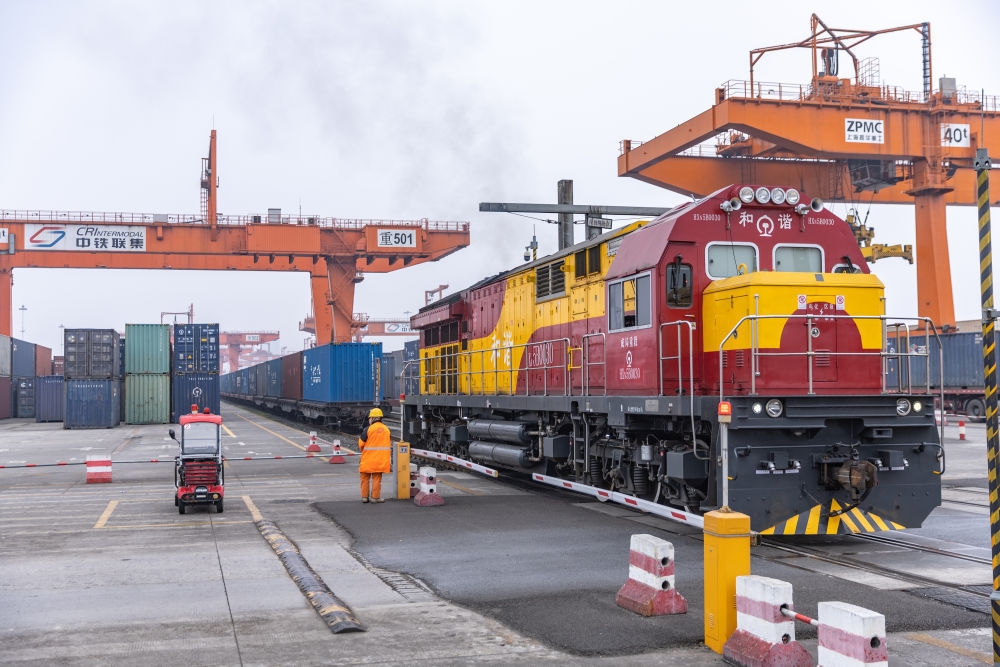 3月7日,一列满载机械设备、整车及零部件等货物的中欧班列在重庆团结村中心站等候发车。新华社记者 黄伟 摄