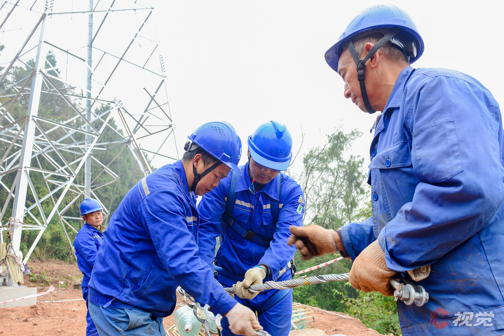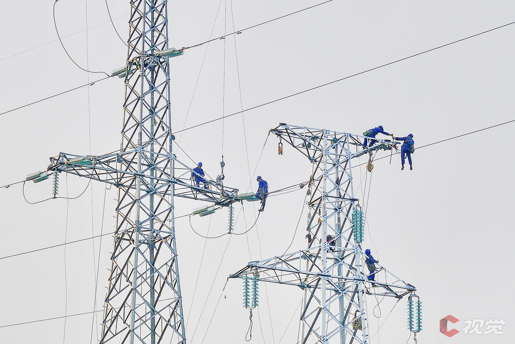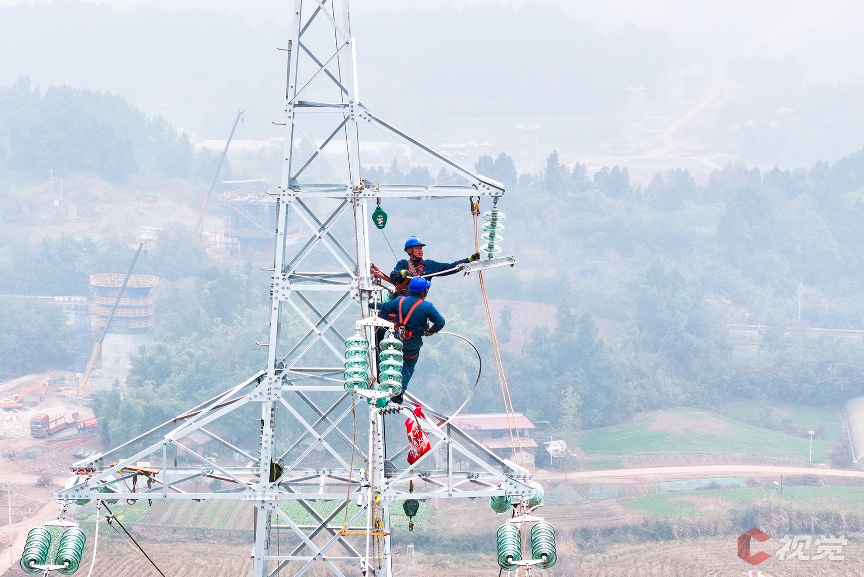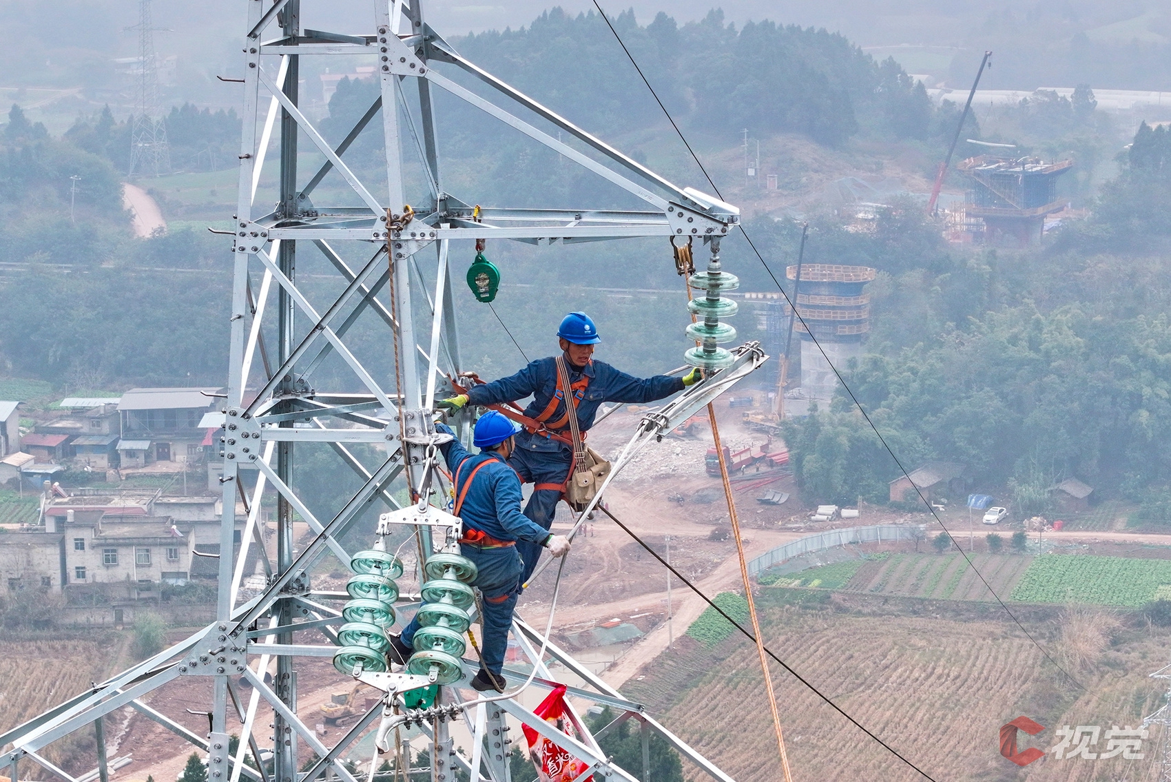 12月16日,在简阳市禾丰镇,国网简阳市供电公司作业人员在110千伏普宝线N4号塔加装附件。