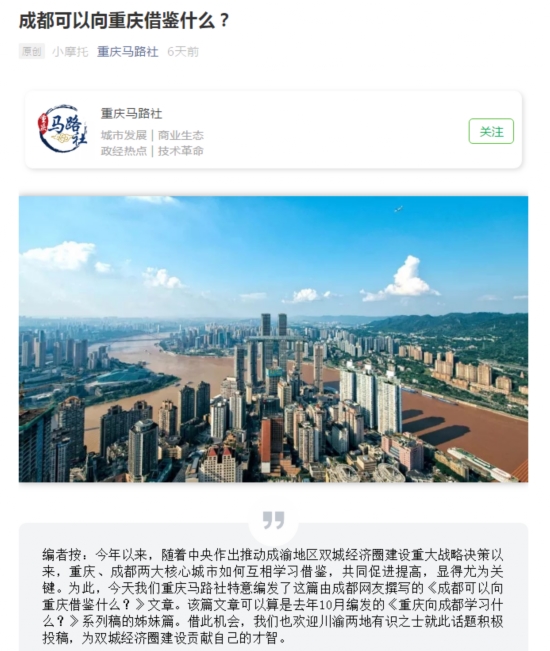 该公号运营者陈卜文说,在收到成都网友的这篇投稿后,“我们非常兴奋,这体现了重庆、成都两地网友的一种良性互动。所以我们将这篇文章与去年10月编发的《重庆向成都学习什么?》系列稿称为姊妹篇。”