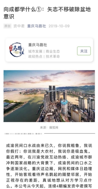 这组文章,有两万余字。作者“资中君”认为,重庆应该从五个方面向成都学习:矢志不移破除盆地意识、毫不动摇实施强省会战略、大手笔的战略谋划、砸锅卖铁也要建高铁、大力实施城市营销战略。