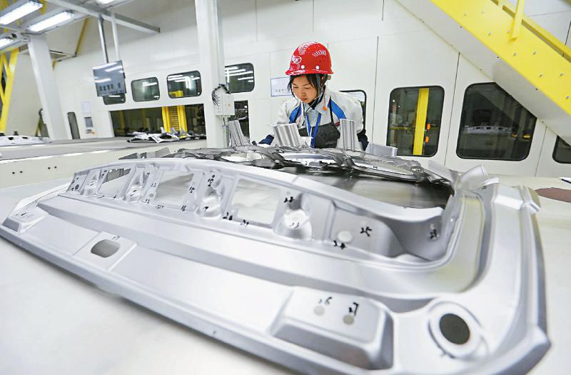 宜宾市临港区宜宾汽车产业园的凯翼汽车智慧工厂生产车间内,工人正在对冲压产品进行检测。兰锋 摄(视觉四川资料图片)
