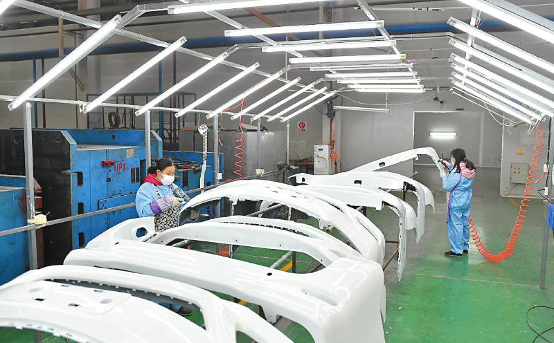绵阳秦川恒远汽车电器有限公司内外饰车间里,工人正在生产汽车保险杠。 蒲滔 摄(视觉四川资料图片)