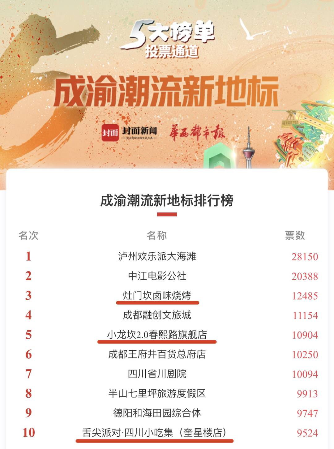 子榜单“成渝潮流新地标”:1、泸州欢乐派大海滩28150票 2、中江电影公社20388票 3、灶门坎卤味烧烤 12485票