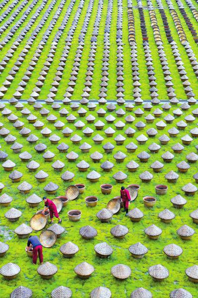 鸟瞰泸州市合江县佛荫镇酱油酿造坊晒露场,5万口晒露缸依次排列,工作人员正在忙碌地晾晒“五比一”酱油。