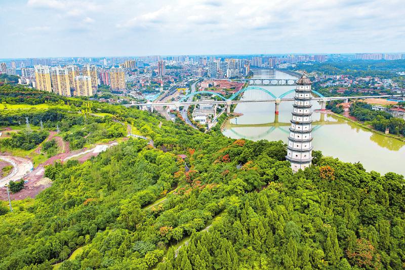 鸟瞰内江市市中区城南新区,这是该市的“绿肺”塔山公园。