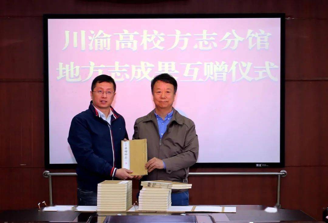 2020年10月16日,重庆市地方志办公室主任刘文海向四川省方志馆四川大学分馆(川渝共建)赠送重庆地方志书,四川大学图书馆副馆长张盛强接受赠书