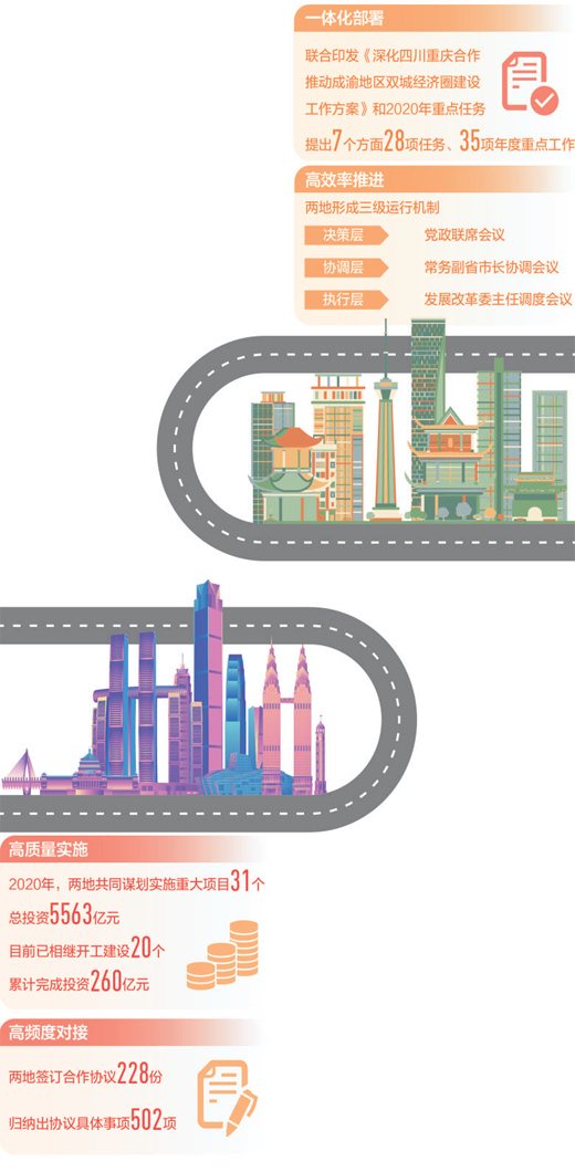 2020年,是双城携手共进、大手笔接连不断的一年:牵手31个重大项目,总投资5563亿元;能源一体化正加速,20个重大项目总投资约9900亿元;双城携手多地共同推进西部陆海新通道建设,共建省际协商合作联席会议制度;两省市有关部门、市区(县)签署各类协议228份,多数事项进展良好……