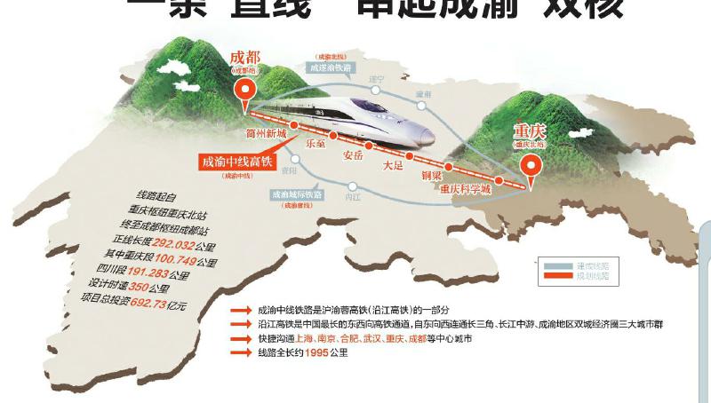 最快,与里程短、速度快有关。摊开地图可以看到,成渝“双核”间4条铁路中,开行动车组的有3条铁路线。其中,北线成遂渝铁路经遂宁、潼南到重庆,南线成渝高铁经资阳、内江至重庆,而成渝中线高铁位居其中,从成都经乐至、安岳、大足、铜梁至重庆,在成渝“双核”间拉出一条直线。从速度来看,350公里/小时是目前国内高铁最高时速。