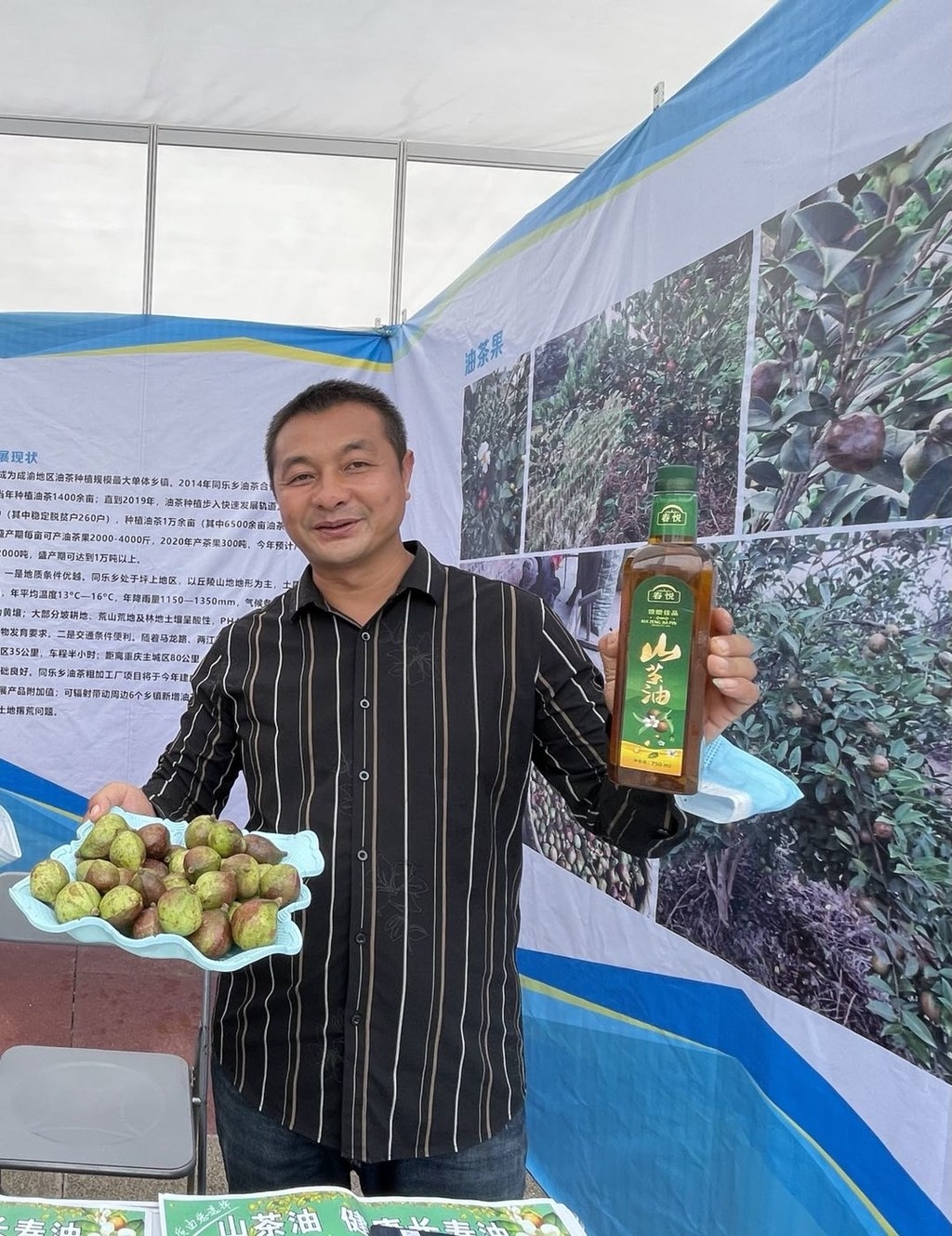黄委的展示台与陈章燕邻近,台上整齐摆放着从油茶果里提炼出来的茶油。这名来自重庆涪陵区同乐乡的返乡创业农民工,以前在成都一家绿化公司务工,学到经验后回到家乡从事花卉苗木种植。有一次到湖南广西采购种苗,发现了种植油茶的商机,从而开始种植油茶。“现在我们自己建了加工厂,辐射带动涪陵区周边五六个乡镇种油茶,面积近三万亩。”