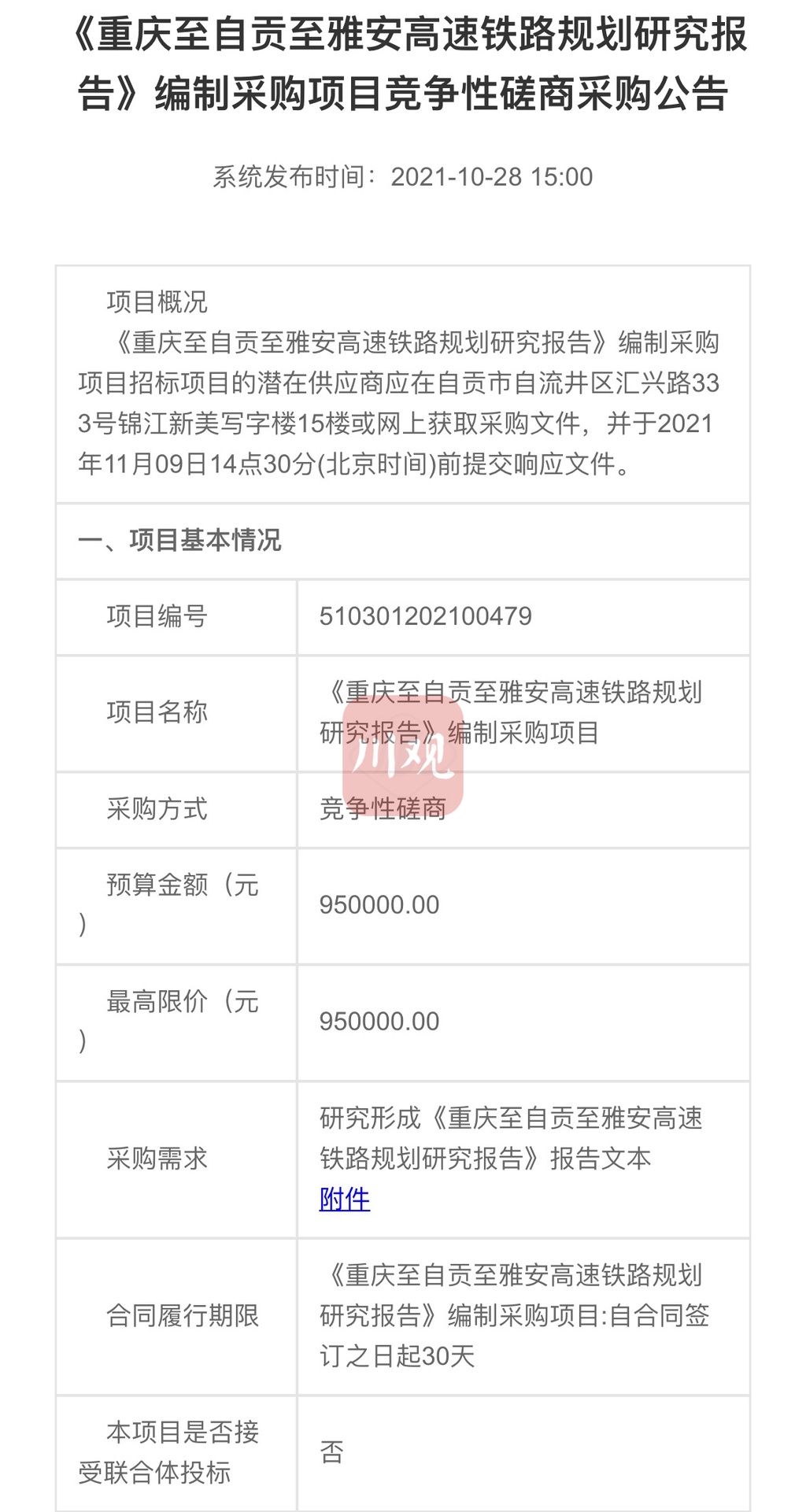 11月1日,四川在线记者从政府公开网站得知,《重庆至自贡至雅安高速铁路规划研究报告》编制采购项目竞争性磋商采购公告已于近期发布。该项目纳入了《成渝地区双城经济圈建设规划纲要》,由自贡市发展改革委牵头进行前期研究。