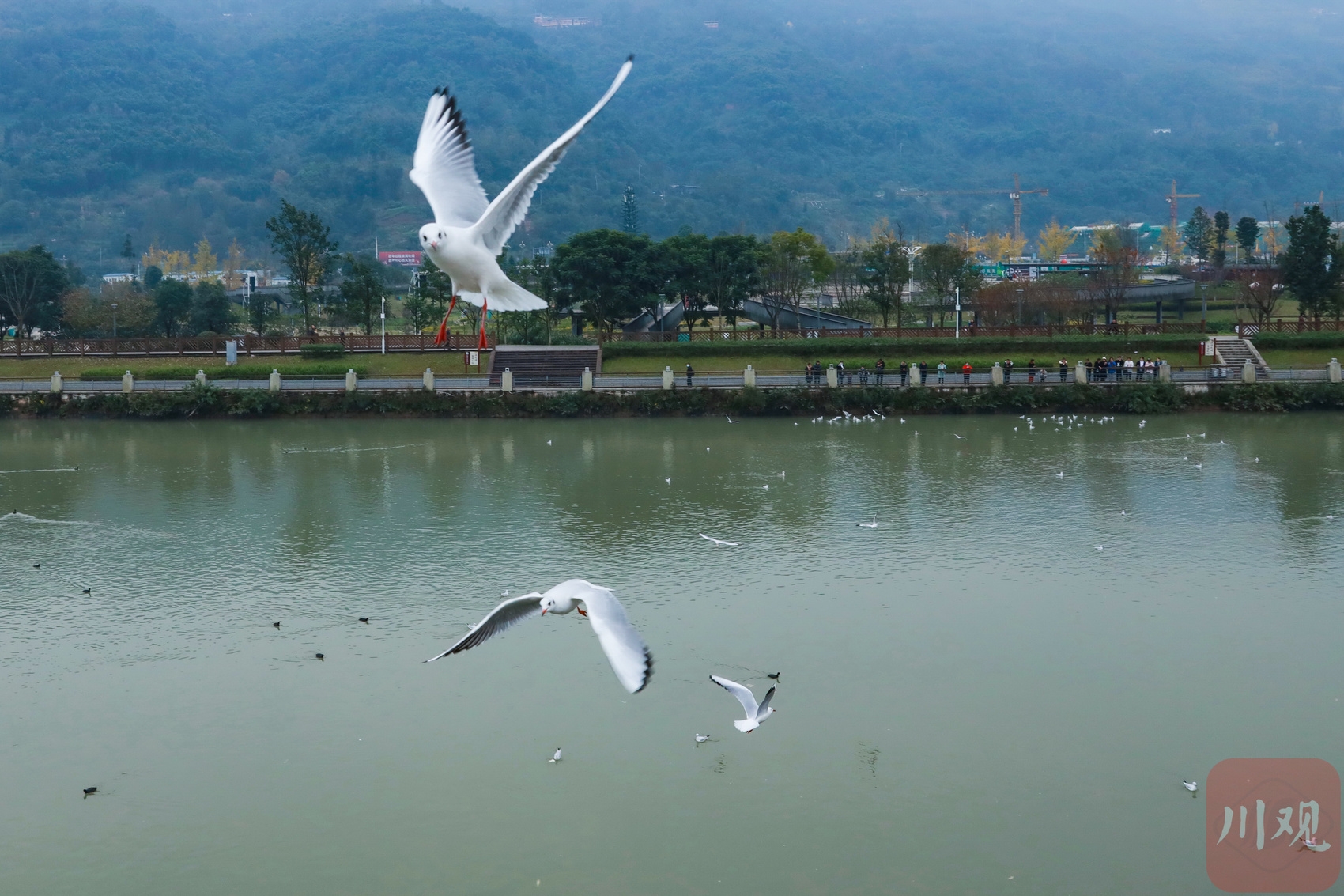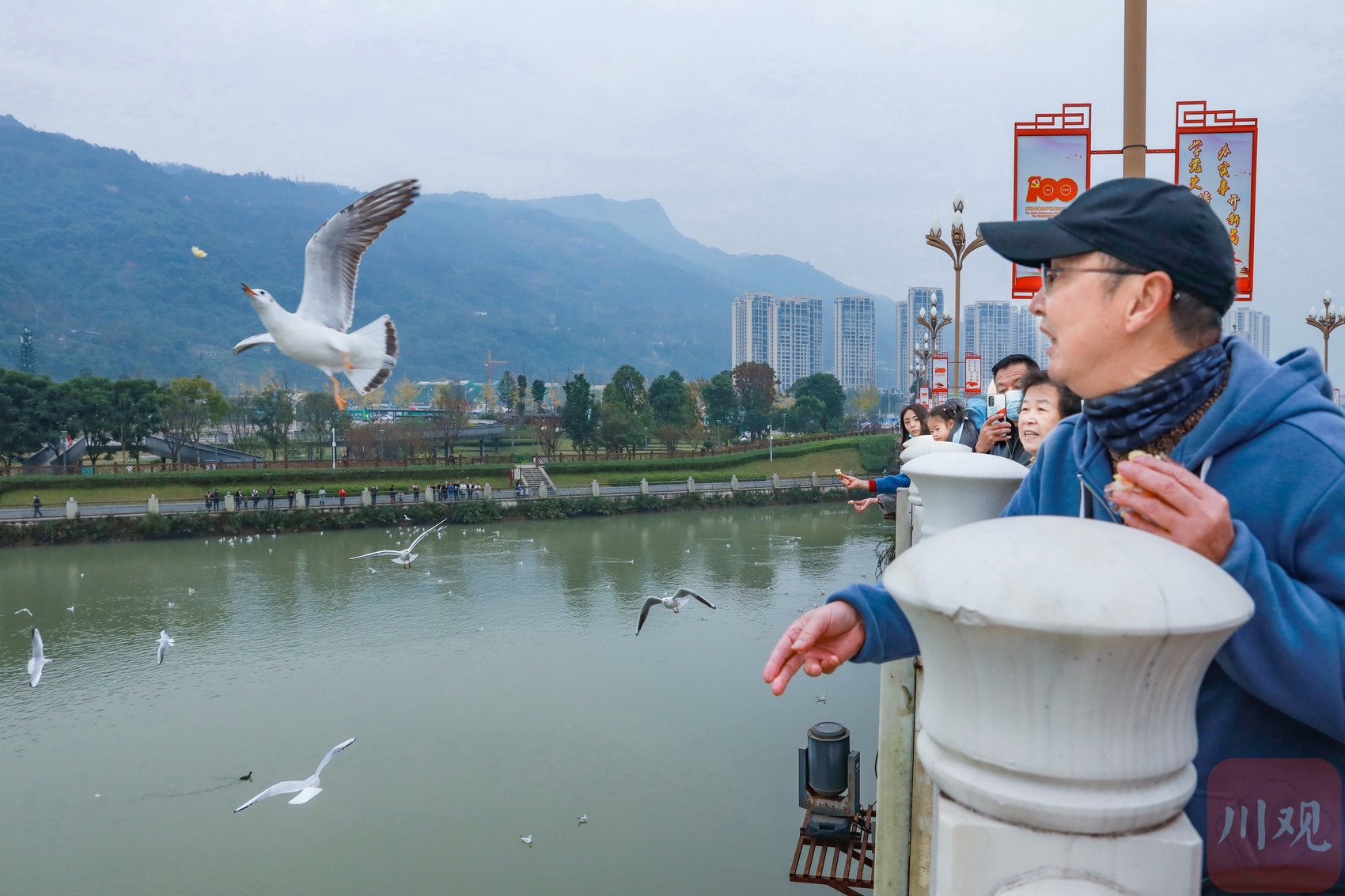 11月23日,雅安市区青衣江大桥桥头,红嘴鸥、野鸭等候鸟在江面翱翔,不时飞到人群中叼走市民投喂的食物。青山绿水之间,候鸟成群而过——每年候鸟越冬之时,这是雅安青衣江畔的“日常”画面。