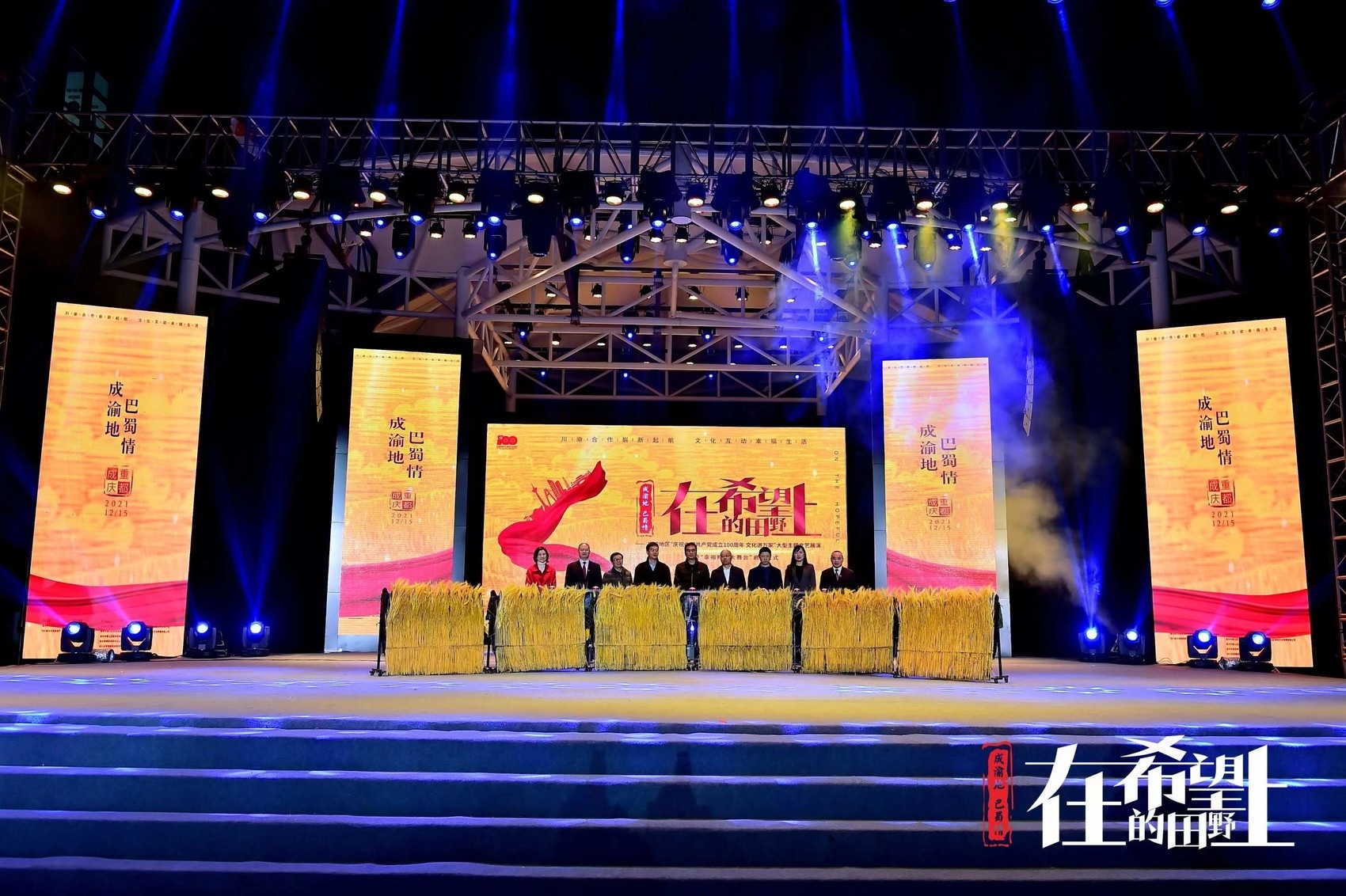 12月15日晚,《在希望的田野上》——川渝地区“庆祝中国共产党成立100周年文化进万家”大型文艺展演暨“幸福时光大舞台”启动仪式在重庆市璧山区璧泉街道幸福时光大舞台盛大献演。来自四川、重庆两地省市县三级200余名群众与重庆歌舞团、四川省歌舞剧院等西南地区顶级专业舞蹈院团演员们同台演出,集中展示川渝地区群众对美好生活向往和奋发奋进的精神风貌。这也是继2020年7月川渝两地深化合作开展“在希望的田野上——川渝地区脱贫攻坚奔小康大型主题文艺展演”之后,两地深化合作的又一重要成果。