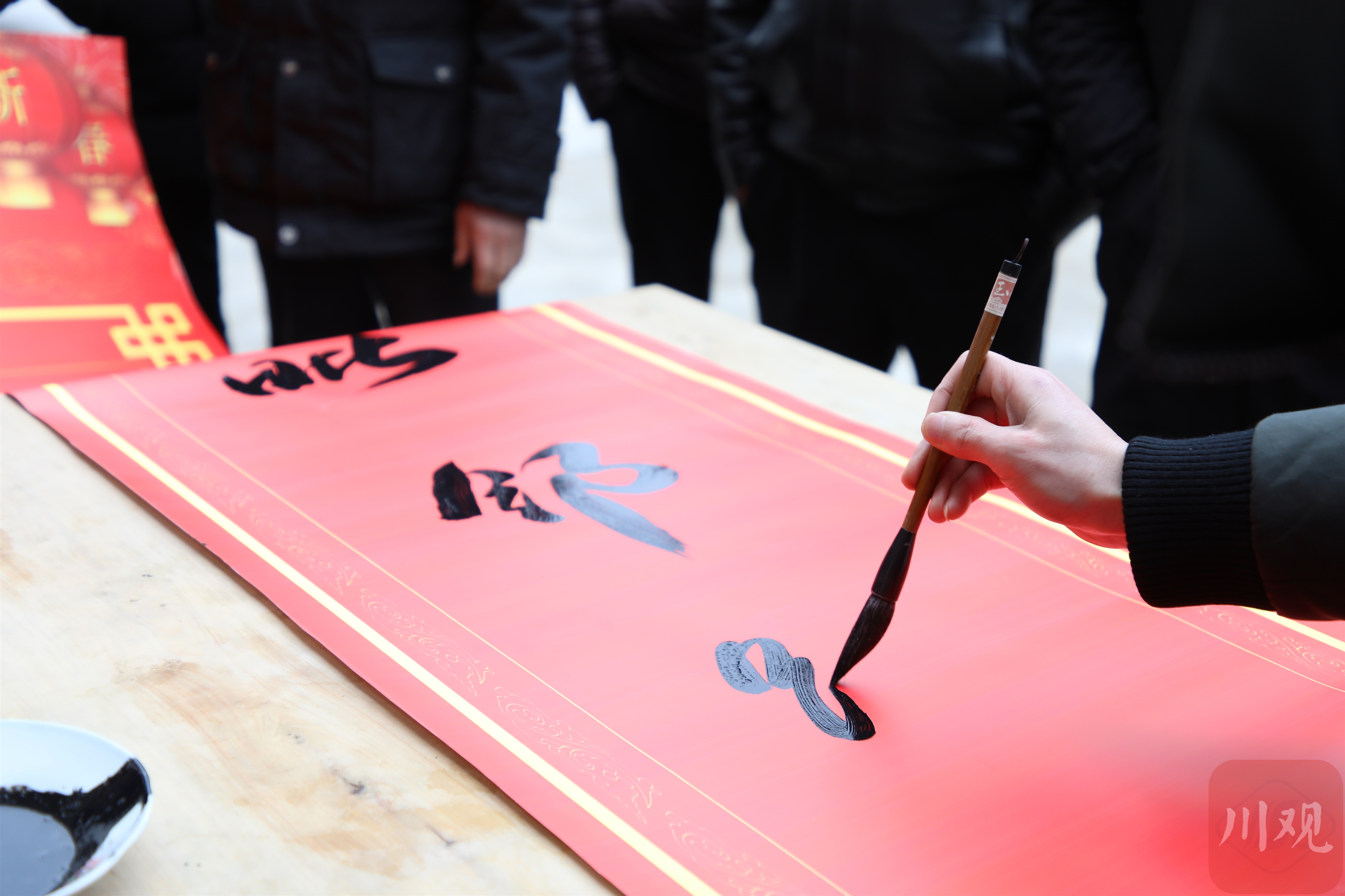 “欢迎,欢迎啊!”在聚会现场,当地宣传干部何努首先送出好礼,拿出笔墨现场书写春联,“川渝毗邻路路相通,稻渔连片产产相融”“邻里携手骨肉相连,心手相牵共建家园”。