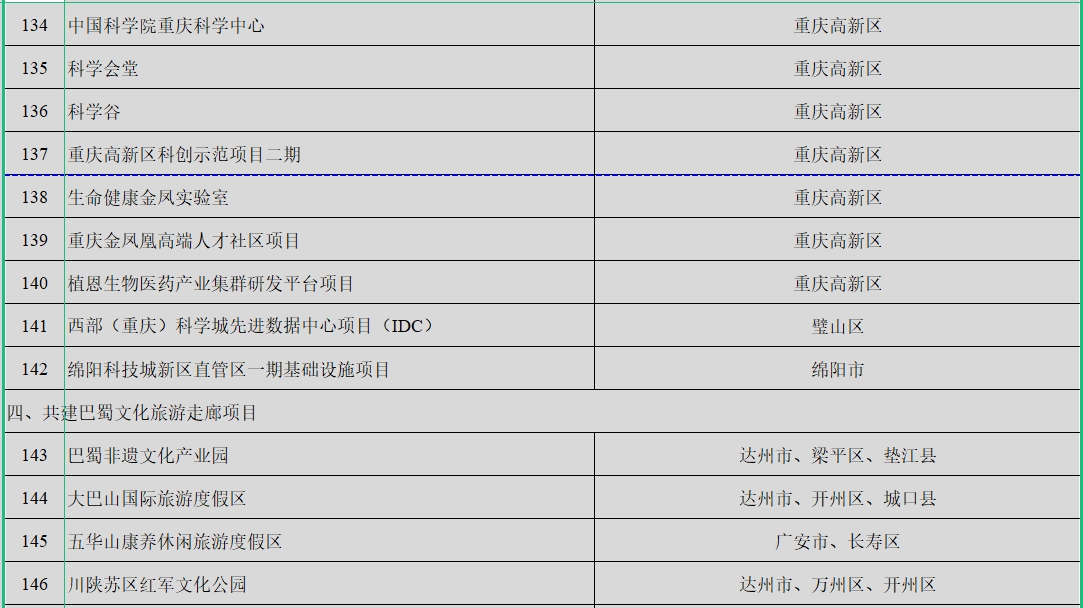 在具体领域上,则分属合力建设现代基础设施网络项目、协同建设现代产业体系项目、共建科技创新中心项目、共建巴蜀文化旅游走廊项目、生态屏障项目、公共服务项目等领域。其中,合力建设现代基础设施网络项目投资最大,40个合计总投资13461亿元,今年计划投资883亿元。紧随其后的协同建设现代产业体系项目共有72个,估算总投资5402亿元,今年计划投资728亿元。而共建科技创新中心项目30个,估算总投资750亿元,今年计划投资127亿元。