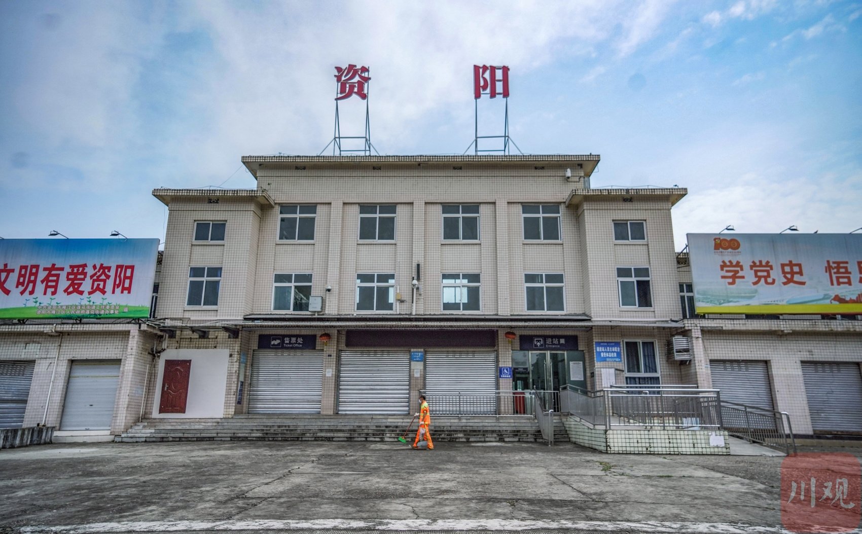 资阳站的进站口已经封闭,站前广场上少有人经过,稍显冷清。如果不是看到站房上的“资阳”二字,很难把这个低矮建筑与印象中繁忙的火车站联系起来。