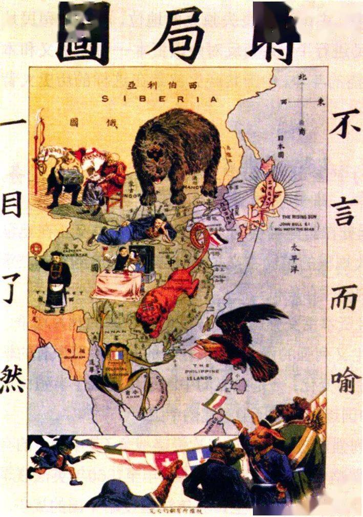 1840年鸦片战争后,独立的中国逐步沦为半殖民地中国,封建的中国逐步变成半封建中国。为挽救国家和民族的危亡,中国人民进行了英勇的抗争和艰苦的探索,但这些探索没有能改变中国的社会性质和人民的悲惨命运。 图为清末反映列强侵略中国形势的《时局图》。