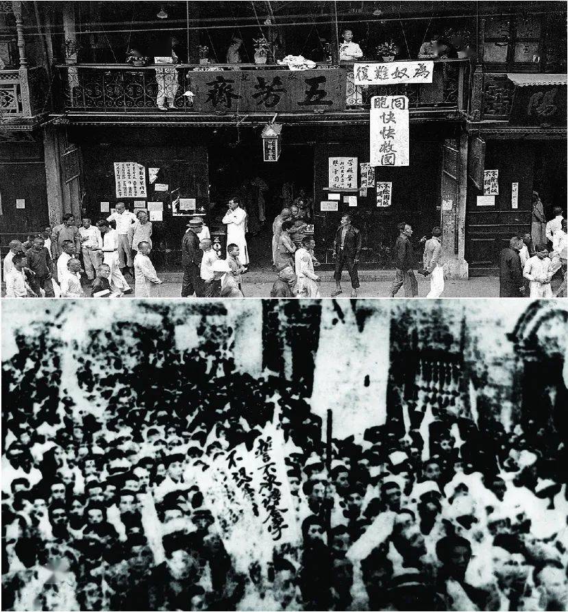 1919年6月3日,北洋政府大肆逮捕学生,自此五四运动进入新的阶段。5日上海工人开始罢工。同日,学生界罢课、商界罢市,开始了罢工、罢课、罢市的“三罢”斗争。上海的“三罢”斗争迅速蔓延全国,促进了全国各地的群众性政治斗争。中国工人阶级开始以独立的姿态登上政治舞台。迫于人民群众的压力,6月28日,中国代表没有出席巴黎和约的签字仪式。 上图为上海南京路五芳斋门口的罢市街景;下 图为上海工人大罢工的情景。