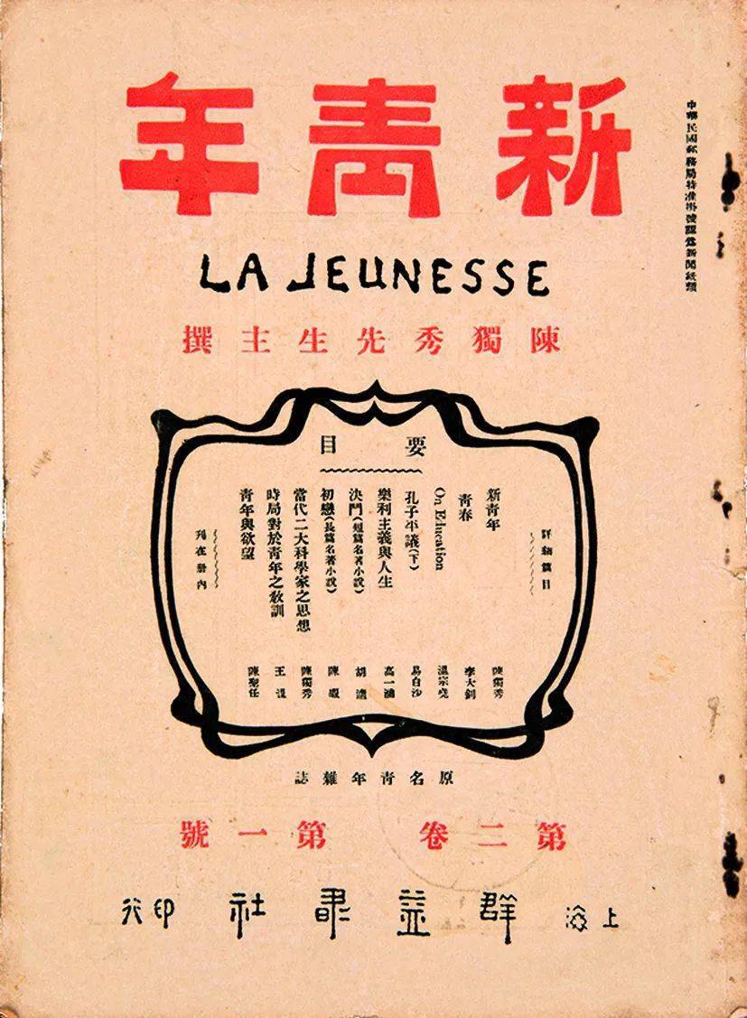 辛亥革命后,先进的中国知识分子继续探索中国新的出路。1915年9月15日,陈独秀主编的《青年杂志》月刊(翌年更名为《新青年》)在上海出版,吹响了新文化运动的号角。新文化运动高举民主和科学的大旗,猛烈抨击封建主义思想,从而使中国思想界发生巨大震动,影响了一代青年。 图为《新青年》1916年9月第2卷1号。