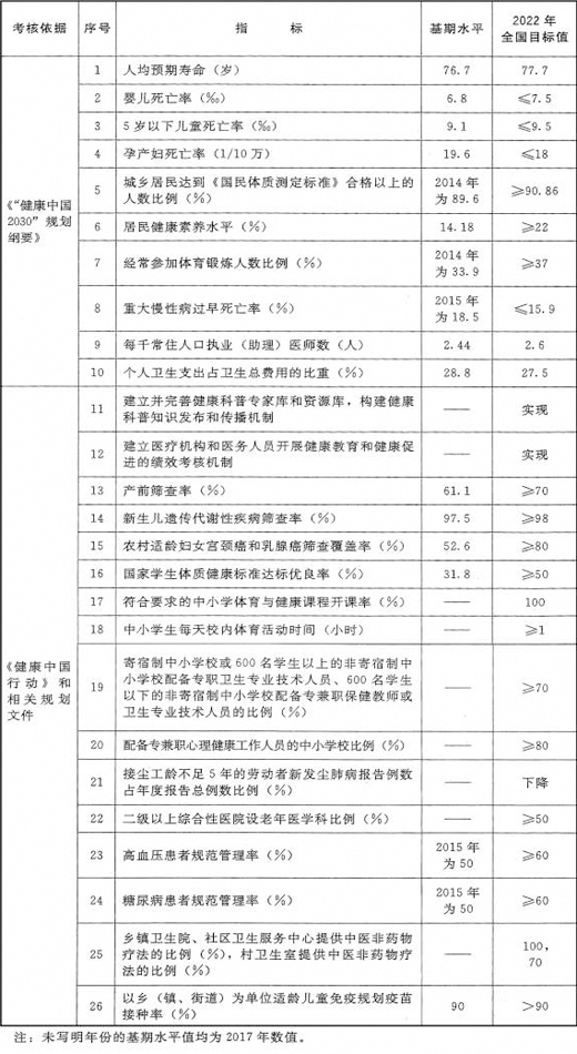 (二)考核内容。围绕健康中国建设主要目标任务要求,同时兼顾数据的可获得性,建立相对稳定的考核指标框架(见附件)。各省(区、市)在对下一级进行考核时,可根据本地实际情况对考核指标进行调整完善。