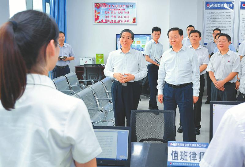 7月17日,中共中央政治局委员、中央政法委书记郭声琨在省委书记彭清华陪同下,到宜宾市临港经开区白沙湾街道司法所调研,了解规范化建设情况。 本报记者 欧阳杰 摄
