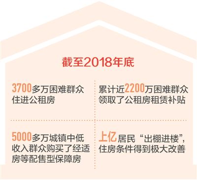 截至2018年底,通过购买经济适用住房等配售型保障房,5000多万买不起商品住房、又有一定支付能力的城镇中低收入群众有了合适住房,3700多万困难群众住进公租房,累计近2200万困难群众领取了公租房租赁补贴,上亿居民“出棚进楼”,住房条件得到极大改善。
