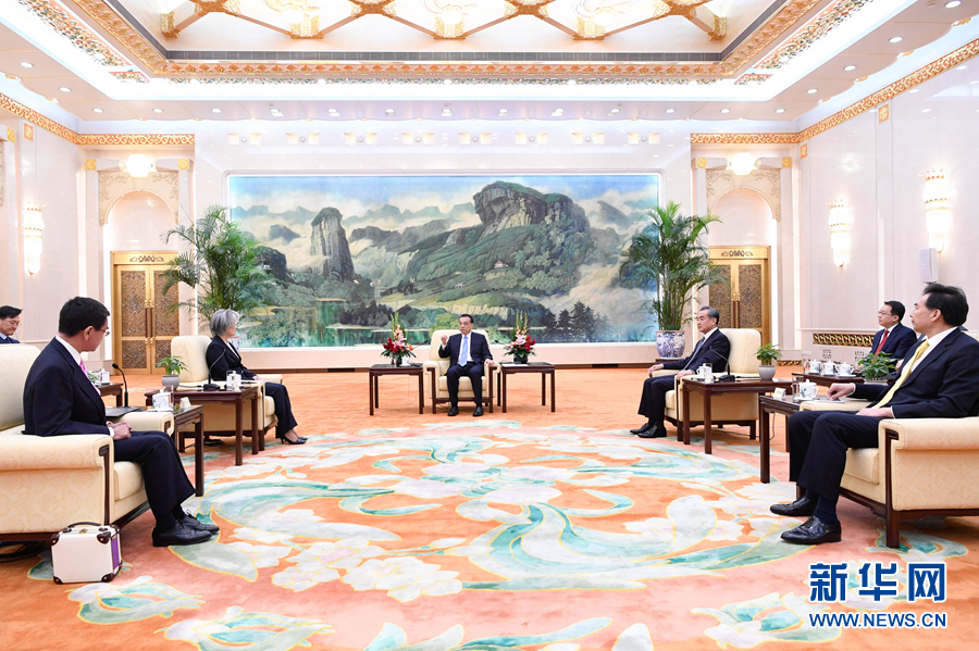 8月22日,国务院总理李克强在北京人民大会堂会见来华出席中日韩外长会的韩国外长康京和、日本外相河野太郎。 新华社记者 申宏 摄
