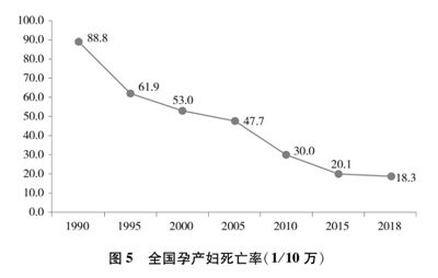 妇女健康水平持续提高。2015年,妇女平均预期寿命为79.4岁,比1981年提高了10.1岁,比新中国成立时提高了42.7岁。孕产妇死亡率持续降低,提前实现联合国千年发展目标。2018年,全国孕产妇死亡率为18.3/10万,比1990年的88.8/10万大幅下降了79.4%(图5)。城乡差距不断缩小,城市与农村孕产妇死亡率之比从1990年的1∶2.2下降到2018年的1∶1.3。