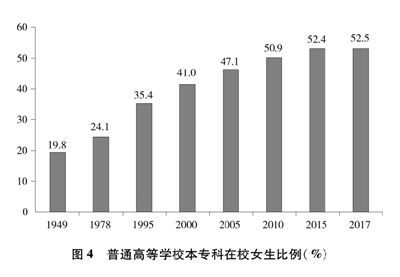 妇女接受高中阶段和高等教育水平实现历史新高。中国高度重视教育发展,女性接受高中阶段和高等教育的机会不断增加。改革开放40多年来,大力普及高中阶段教育,加大中西部贫困地区扶持力度,实行家庭经济困难学生资助政策,女性接受高中阶段教育的机会显著增多。2017年,高中阶段教育毛入学率达到88.3%,高中阶段教育在校女生占在校生总数的47.7%,其中普通高中在校生中女生比例已达50.9%。1998年颁布《中华人民共和国高等教育法》,不断扩大高等教育规模,推行助学贷款制度,设立助学奖学金,为更多女性接受高等教育创造了条件。2017年,普通高等学校本专科在校女生占在校生总数的比例已达52.5%,比1978年提高28.4个百分点,比1949年提高32.7个百分点(图4);女研究生占研究生总数的比例已达48.4%,比1985年提高29.8个百分点。