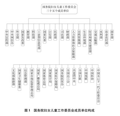 建立健全政府贯彻落实男女平等基本国策的工作机制。1990年成立国务院妇女儿童工作协调委员会,1993年更名为国务院妇女儿童工作委员会,成员单位由成立之初的19个增加到目前的35个(图1)。国务院妇女儿童工作委员会依据法定职能开展工作,负责组织、协调、指导和督促有关部门做好保障妇女权益、促进男女平等和妇女发展的相关工作。委员会下设办公室,配有专职工作人员和专项工作经费。全国县级以上政府和新疆生产建设兵团均成立了相应工作机构,形成了纵向贯通、横向联动、协同配合的组织工作体系。国民经济和社会发展总体规划、部门专项规划将促进妇女发展作为重要方面。《中华人民共和国国民经济和社会发展第十二个五年规划纲要》《中华人民共和国国民经济和社会发展第十三个五年规划纲要》设立专门章节,对促进妇女全面发展作出规划部署。国家人权行动计划、中国反对拐卖人口行动计划等明确提出保障妇女权益的目标任务。1995年以来,中国连续颁布三个周期的中国妇女发展纲要,提出不同时期妇女事业发展的目标任务;2019年,启动了新一周期的纲要编制工作。建立完善性别统计制度,发布中国妇女发展纲要统计监测报告,定期开展中国妇女社会地位调查,出版《中国社会中的女人和男人:事实和数据》《中国妇女儿童状况统计资料》等。