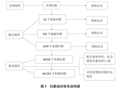 建立健全妇联组织作为党和政府联系妇女群众桥梁纽带的工作机制。全国妇联是各族各界妇女为争取进一步解放与发展而联合起来的群团组织,是中国共产党领导下的人民团体,目前已形成由全国、省(区、市)、市(地、州)、县(市、区)、乡镇(街道)、村(社区)六级妇联组织,机关事业单位、社会组织的妇女委员会或妇女工作委员会,以及团体会员构成的组织体系(图2),同时,新领域新业态新阶层新群体中的妇联组织覆盖不断拓展。在党的领导下,妇联组织依照章程,切实担负团结引导各族各界妇女听党话、跟党走的政治责任,切实履行代表和维护妇女权益、促进男女平等和妇女全面发展的基本职能。围绕党和国家工作大局,广泛深入宣传党的理论路线方针政策,团结引导广大妇女坚定不移走中国特色社会主义妇女发展道路,充分发挥在社会生活和家庭生活中的独特作用,为中国特色社会主义事业建功立业。全国妇联作为成员单位参与中央农村工作领导小组、中央精神文明建设指导委员会、中央全面依法治国委员会守法普法协调小组、国务院扶贫开发领导小组和国务院就业工作领导小组等的工作,反映妇女利益诉求,代表妇女参与国家和社会事务的民主决策、民主管理和民主监督。全国妇联牵头成立“双学双比”和“巾帼建功”活动领导小组、“五好文明家庭”创建活动协调小组、维护妇女儿童权益暨平安家庭创建协调机制等,通过跨部门合作共同推动妇女事业发展。党的十八大以来,妇联组织通过改革创新,进一步增强政治性先进性群众性,充分发挥党开展妇女工作最可靠、最有力的助手作用,坚持用中国特色社会主义共同理想凝聚妇女,建立直接联系服务妇女群众长效机制,有效开展引领、服务、联系妇女群众工作。团结引领其他妇女组织,共同服务妇女群众,推动男女平等和妇女事业发展。
