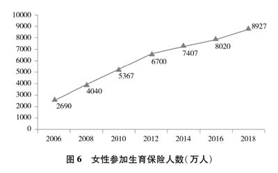 妇女生育保障水平大幅提高。积极推进生育保障制度建设,保障妇女生育权益。从1949年到1992年,相继出台劳动保险条例、公费医疗以及女工产假等政策规定,生育女性享有产假及生育津贴、生育补助和医疗服务费用报销等待遇。1994年出台《企业职工生育保险试行办法》,对生育保险的筹资、待遇等作出规定,标志着城镇职工生育保险制度的全面推行。2010年颁布的《中华人民共和国社会保险法》设生育保险专章,将部门规章上升为国家法律,为保障妇女生育权益提供法律依据。党的十八大以来,生育保障制度不断完善。2019年出台《关于全面推进生育保险和职工基本医疗保险合并实施的意见》,要求整合两项保险基金及管理资源,确保职工生育期间的生育保险待遇不变、确保制度可持续,有利于扩大生育保险覆盖面,使更多生育妇女受益。2018年,参加生育保险人数达两亿,其中女性8927万(图6)。参加城乡居民基本医疗保险的女性,享受生育医疗费用报销待遇,未就业女性的生育权益得到保障。女职工法定产假由90天延长到98天。各地陆续调整相关法规,设置生育奖励假和配偶护理假,一些地方对相关津贴待遇作出明确规定。