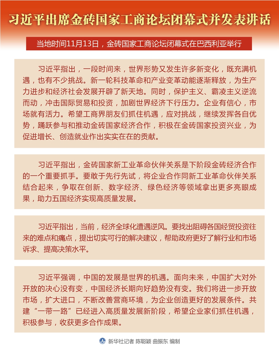 当地时间11月13日,金砖国家工商论坛闭幕式在巴西利亚举行。国家主席习近平出席并发表讲话。 新华社记者 丁海涛 摄